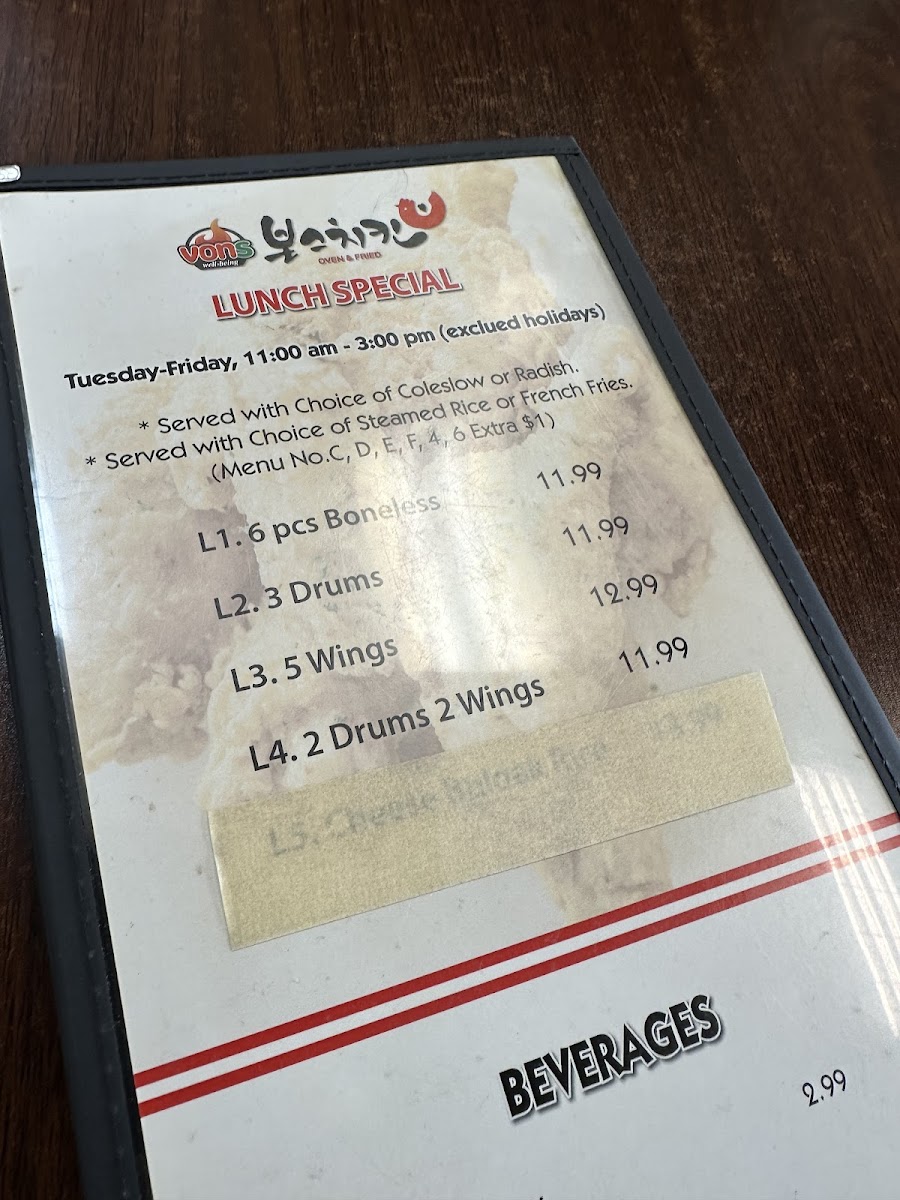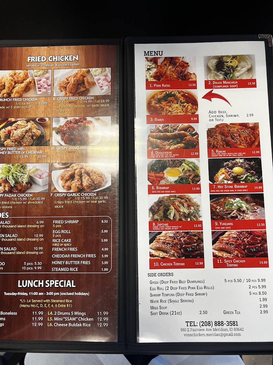 Welcome to Vons Chicken - Meridian, a culinary gem located at 950 E Fairview Ave, Meridian, ID. Known for its authentic Korean-style fried chicken, Vons offers an array of mouthwatering dishes that promise to tantalize your taste buds. Whether you opt for the Crispy Fried Chicken glazed in soy garlic—available in mild or spicy—or indulge in the delectable Cheese Buldak, each bite delivers a delightful crunch. The menu also boasts traditional Korean dishes like Bibimbap and Spicy Pork Bulgogi, ensuring a rich cultural experience.